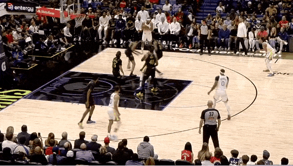坏消息,杰伦·布朗飞身扑球撞到小琼斯腿后,小琼斯被抬下场
